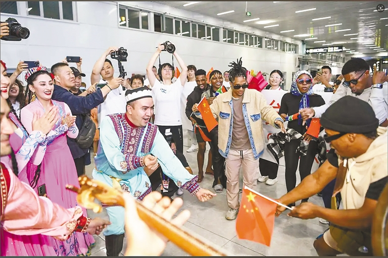 新疆艺术剧院木卡姆艺术团的演员盛情起舞,欢迎前来参加第六届中国新疆国际民族舞蹈节的南非舞蹈演员。新华社记者胡虎虎摄