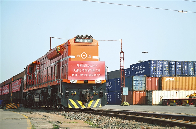 5月20日,2025年首列天津港经霍尔果斯直达塔什干的中亚班列从天津港物捷三堆场发车。新华社记者赵子硕摄