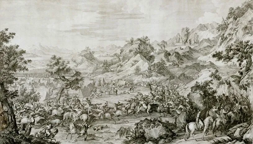 《平定西域战图》之《格登鄂拉斫营》。(图片来源:故宫博物院)