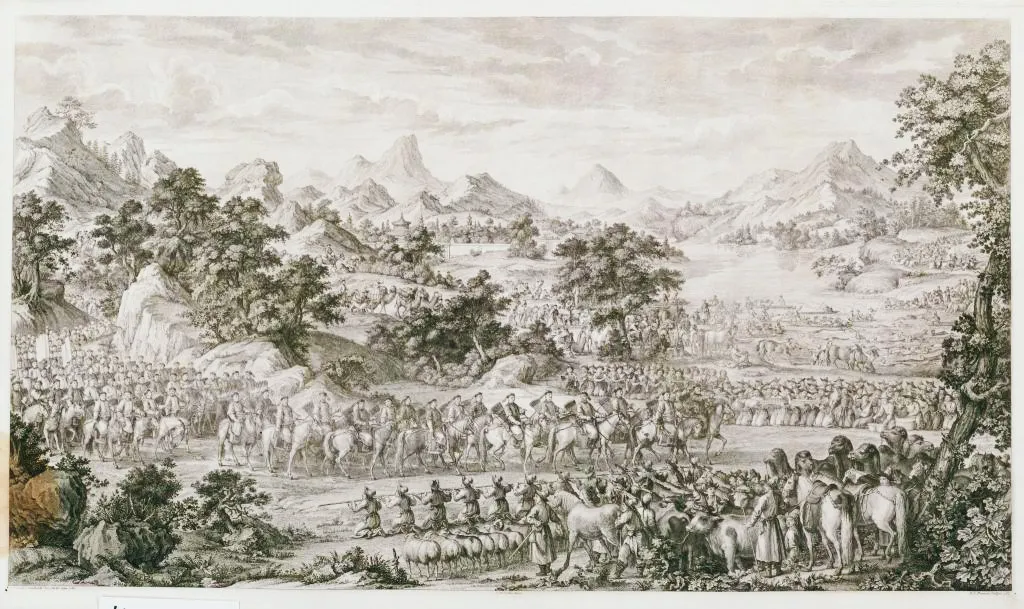 《平定准部回部得胜图册》之《平定伊犁受降》。(图片来源:故宫博物院)